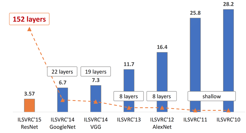 ILSVRC는 ImageNet Large Scale Visual Recognition Challenge의 약자 입니다. 2010년에 시작한 대회로, 물체 탐지(Object Detection), 이미지 분류(Image Classification) 성능을 높이는 대회입니다. ImageNet은 이 분야를 대표하는 거대한 데이터셋 입니다. http://www.image-net.org/에 나와 있는 기록으로는 무려 1420만장의 이미지가 존재합니다. 이러한 데이터셋을 이용하고, 서로간의 경쟁을 촉진하면서 매년 대단한 발전이 있었습니다.