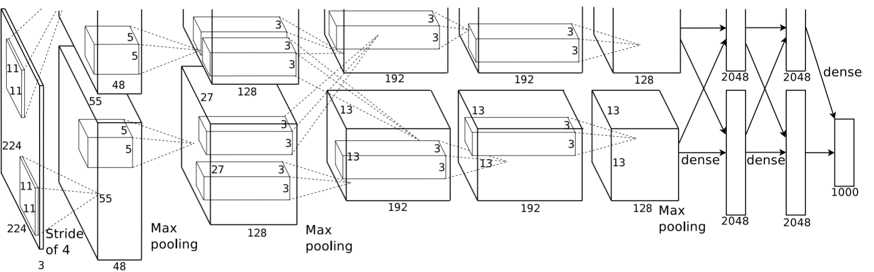 그림을 보시면 마지막 Dense layer를 제외하고는 이미지가 크게 두갈래로 나뉘어 학습이 되는 것을 볼 수 있습니다. Alexnet이 처음으로 GPU를 병렬적으로 학습에 활용한 모델이기 때문입니다. 이 이후에 GPU를 활용해서 학습하는 것이 일반적인 생각이 되었고, 특히 GPU를 활용할 수 있게 CNN을 설계하기 시작했습니다.
