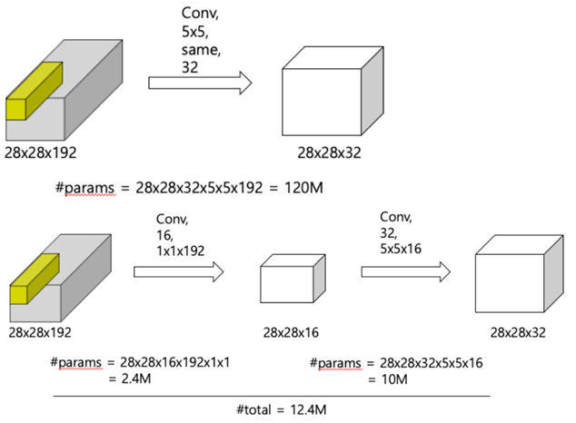 5x5 Conv를 1x1 conv + 5x5 conv 조합으로 바꾸었을때의 그림 입니다. 1x1 conv를 추가했음에도, 원래 얻고자 하는 이미지(28x28x32)를 얻을 수 있습니다. 그런데 계산하는 parameter의 수는 1/10로 크게 준것을 볼 수 있습니다. 그러면서도 성능의 저하는 없다고 알려져 있습니다. 또 1x1 conv에 비선형성을 가지는 활성화 함수를 추가한다면 비선형성을 추가 할 수도 있습니다.