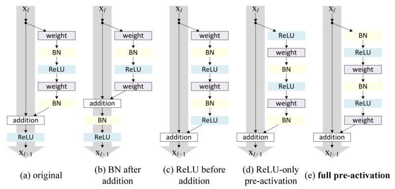 Resnet의 이러한 skip connection(Residual Block)은 꽤 많은 조합으로 시도가 가능합니다. 위의 사진만 보아도 Activation Function의 위치, x를 그냥 add 해줄지, scaling, dropout 등 입니다. 그리고 이에 따라서 결과도 꽤 많이 바뀝니다. 그러나 제가 보기에 자주 사용하는 구조는 아래의 사진들에 나오는 구조 인 것 같습니다.