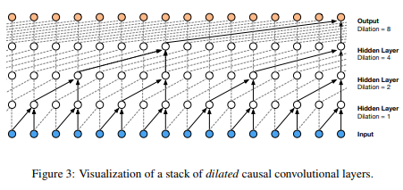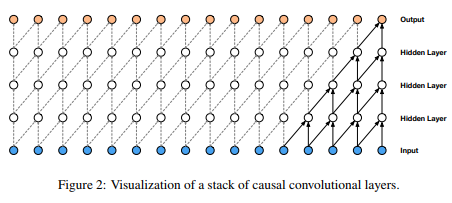 위의 단점을 보완하기 위해서 CNN을 시계열 모델링에 사용하게 됩니다. 위의 사진 처럼 순서(시간)을 고려한 구조를 만들어서 말이죠. 특히 Wavenet은 Causal 개념과 Dilated 개념을 합쳐서