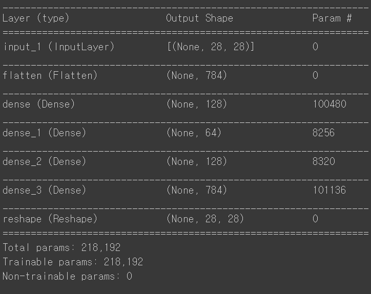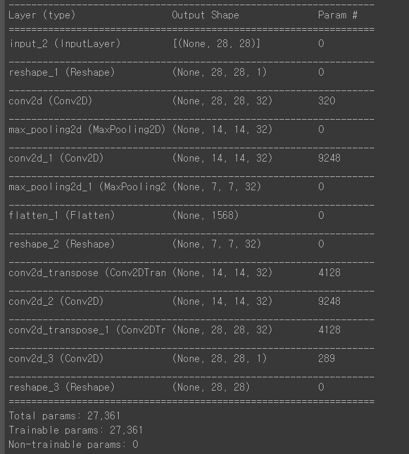 FC layer만 이용한 AE에 비해서 파라메터 수가 많이 적습니다. 하지만 layer가 더 깊기도해서 같은 epoch를 훈련 시키더라도 시간이 더 걸립니다.
