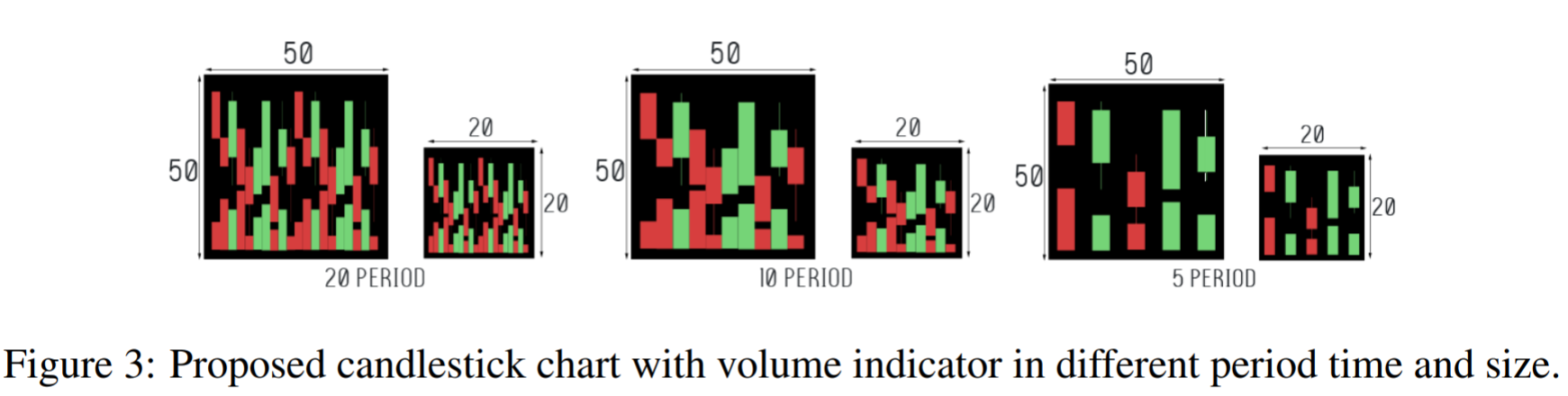 캔들스틱 차트는 위에 보이는 그림처럼 보통 Open, High, Low, Close + (Volume) 데이터를 포함합니다. Volume을 포함하는지 안하는지, 차트에 포함 시킬 기간은 얼마인지, 그림 사이즈는 얼마로 설정할지를 두고 여러가지 실험을 진행했습니다.