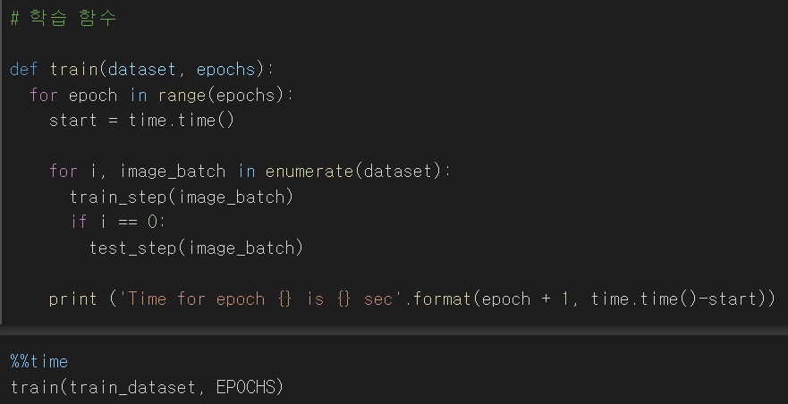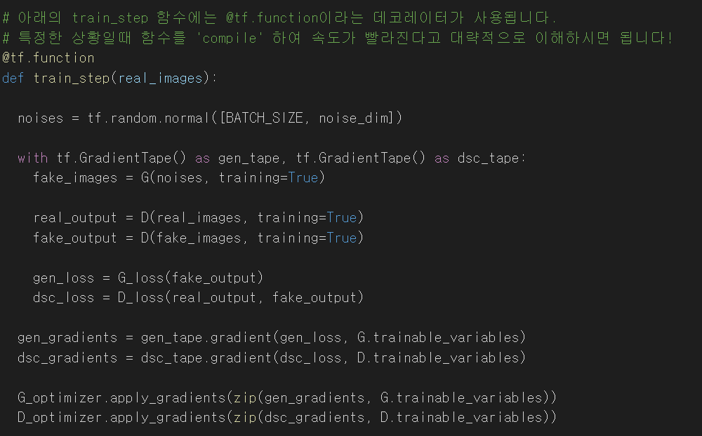 GAN은 훈련을 할때 위와 같이 훈련 코드를 평소보다는 조금 더 자세히 작성해야 합니다. 평소에는 model의 구조를 만들고, model.fit 이런 함수를 통해 훈련을 진행합니다. 위 코드는 model.fit 함수에서 일어나는 일들을 GAN 훈련 방식에 맞게 다시 써줬다고 생각하시면 됩니다.