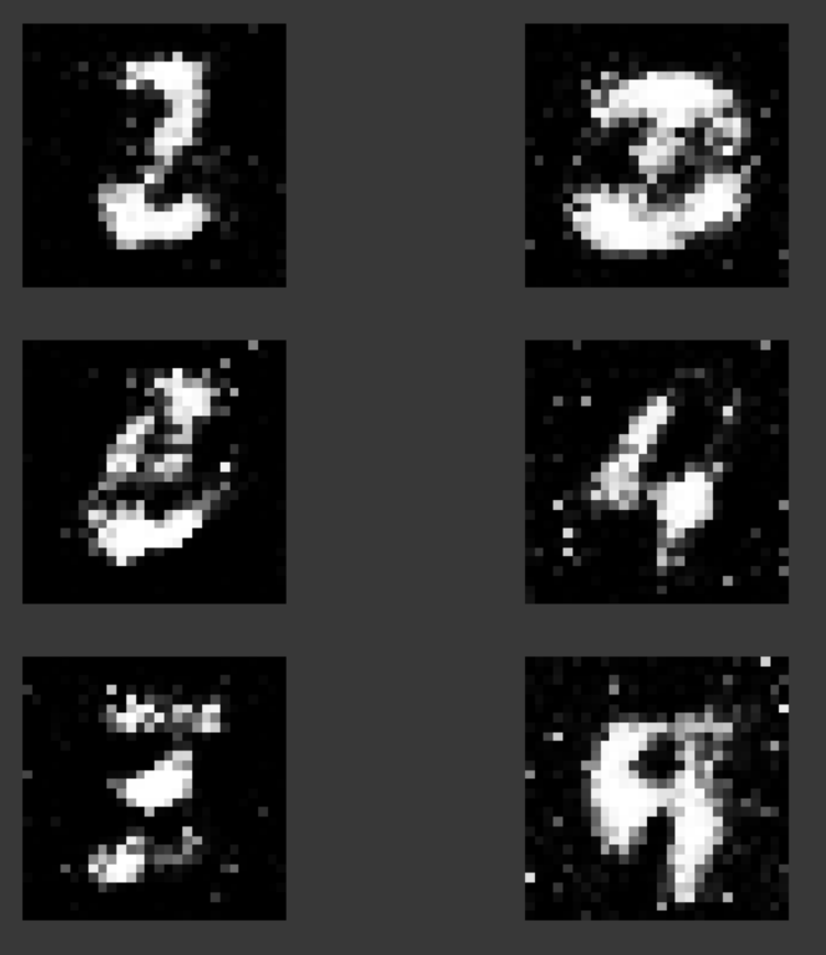 뭔가.... 애매합니다. 사실 label 정보가 주어지지 않고 단순한 noise라서 원하는 숫자를 만들수는 없습니다. 그래도 GAN이 잘 훈련이 되었다면 MNIST에서 나올법한 숫자가 나와야 합니다. 위와 같은 품질의 문제를 해결하기 위해서 DCGAN이 나왔습니다.