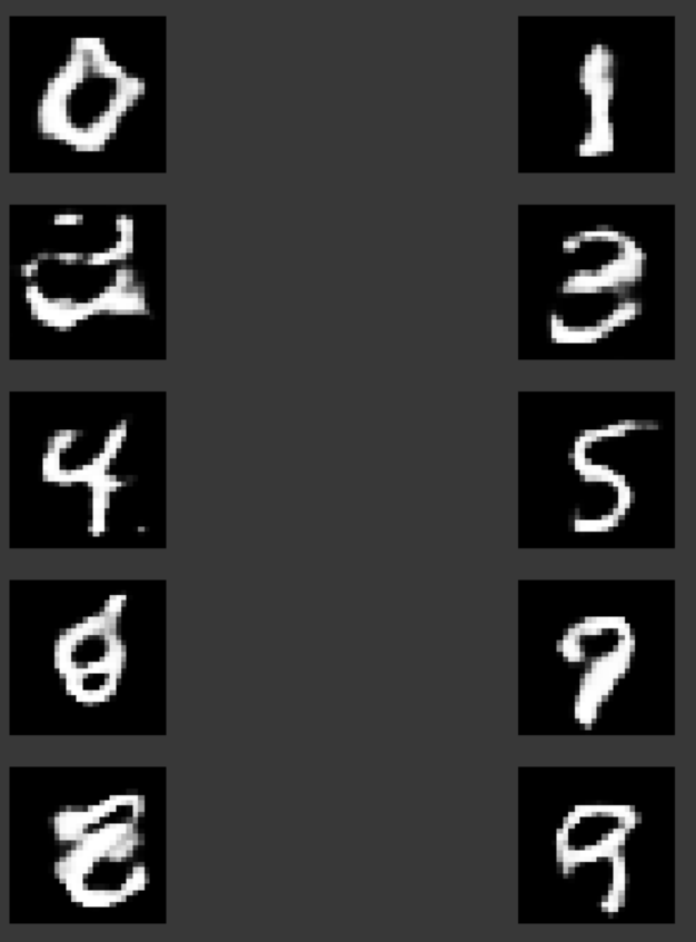 Conditional DCGAN의 장점은 아까 말한것처럼 추가적인 정보를 통해서 더 이미지를 잘 생성해낼수도 있고, 원하는 label에 맞게 이미지를 생성할 수도 있습니다. 위의 경우에는 각각 0~9 까지의 이미지를 생성한 것입니다. 그래도 이번 예제코드 중에서는 제일 괜찮네요. 0,1,3,4,5,9는 특히 누가봐도 그 숫자를 그린 것 같습니다.(아닌가...?)