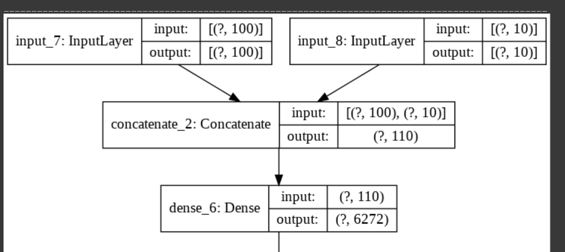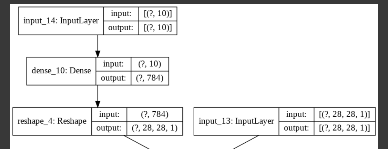 D모델의 경우는 위와같이 넣어주었습니다. D모델의 기존 input은 28*28*1 사이즈의 이미지가 됩니다. 10차원의 label을 28*28*1 크기로 맞춰주기 위해 dense layer와 reshape를 이용했습니다.