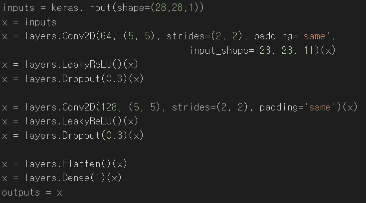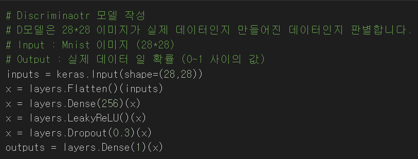 D모델은 28*28 이미지가 input으로 들어오면 이게 실제 sample인지 아니면 G모델에서 만들어진 가짜 sample인지를 판별하게 됩니다.