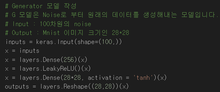 G모델은 100 차원의 random noise로부터 MNIST 데이터의 이미지를 생성하는 모델입니다. Layer는 아주 간단하게 Dense layer 2개로 구성이 되어 있습니다. LeakyReLU와 tanh를 각각의 활성화 함수로 사용하는 이유는 1번에서 말씀드렸다시피 실험적으로 좋은 결과를 주었기 때문입니다.