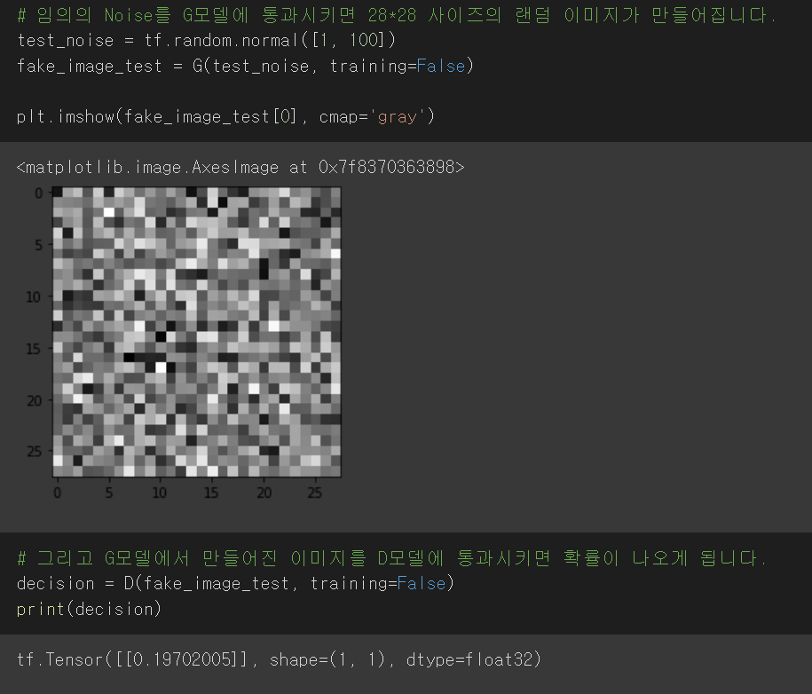 아직 훈련을 시키지 않은 G모델과 D모델을 사용해보면 위와 같은 출력을 보입니다.