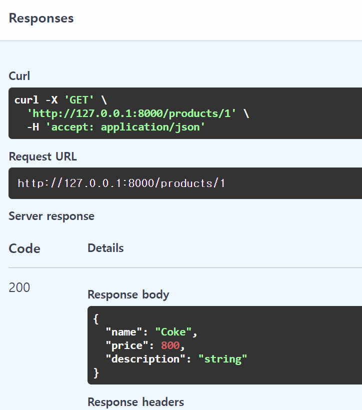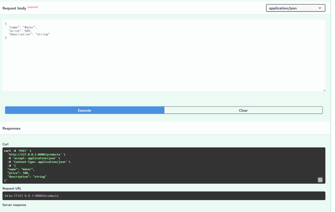 위에서 쭉 진행한 것이 바로 CRUD 기능을 FastAPI로 구현한 것 입니다. 문서로 직접 들어가서 product를 만들고, 조회하고 하는 행동을 서버의 API로 만든 것이고, client가 server로 Request를 보낸 것 입니다.