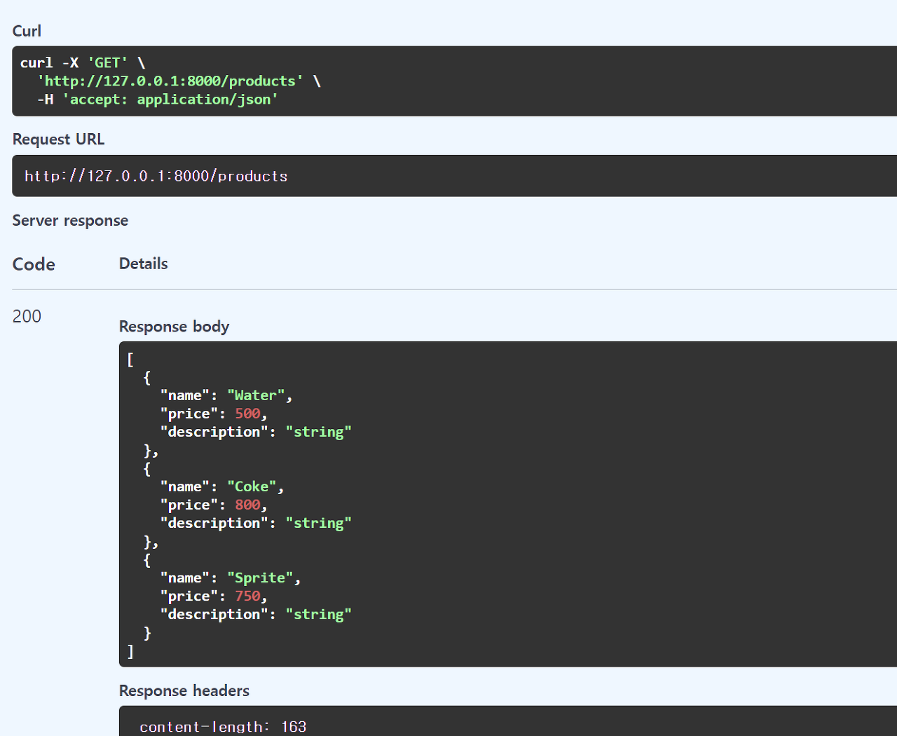 추가로 몇개 더 보내봐도 좋다. 저는 [Coke, 800], [Sprite, 750] 추가했습니다.