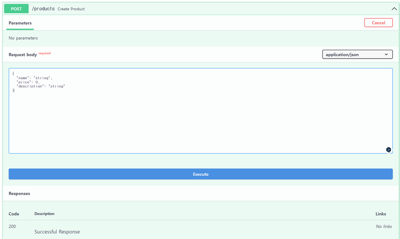 POST /products를 누르고, Try it out을 누르면 아래의 화면이 뜹니다.