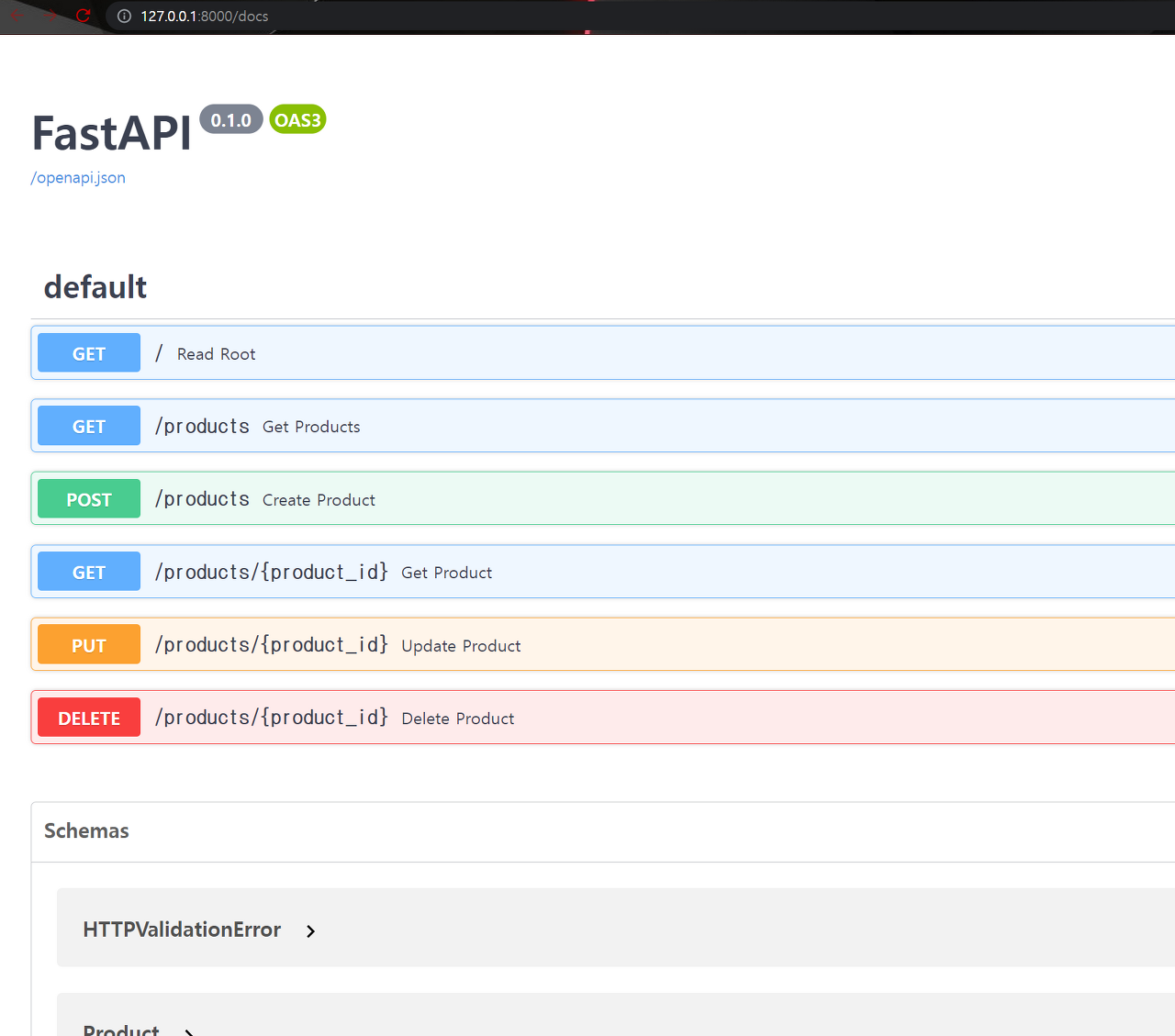 위에서 쭉 진행한 것이 바로 CRUD 기능을 FastAPI로 구현한 것 입니다. 문서로 직접 들어가서 product를 만들고, 조회하고 하는 행동을 서버의 API로 만든 것이고, client가 server로 Request를 보낸 것 입니다.