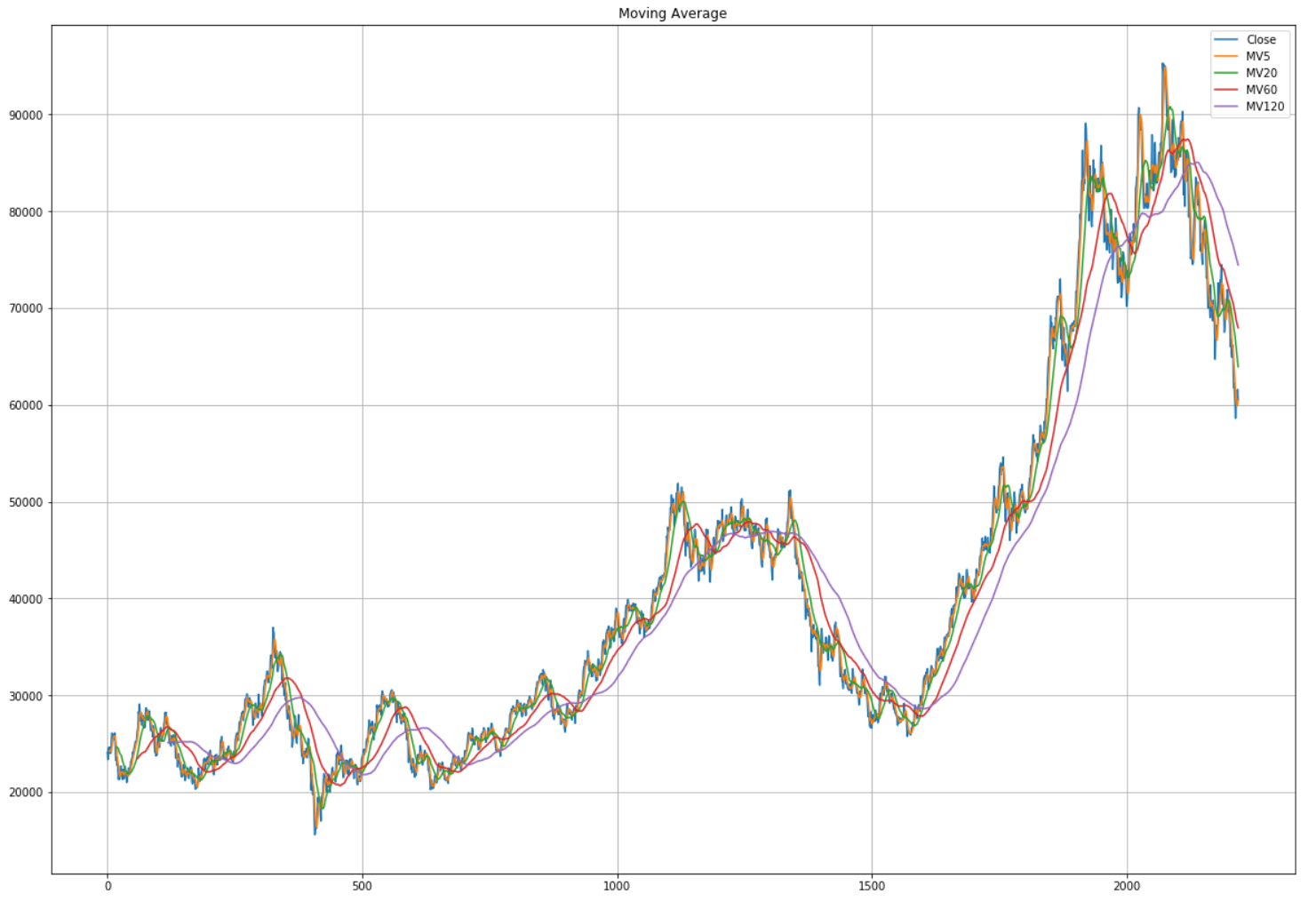이동평균선은 N일 동안의 데이터를 평균낸 데이터 입니다. 일반적으로 5일, 60일, 120일을 각각 단기, 중기, 장기 이동평균선이라고 말합니다. 즉 단기, 중기, 장기의 추세라고 말할 수 있습니다.